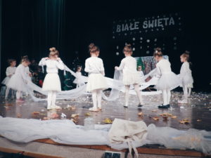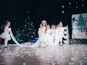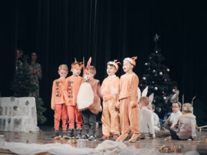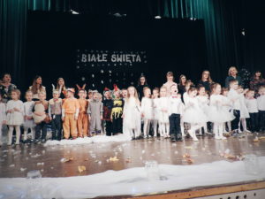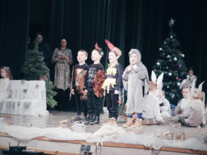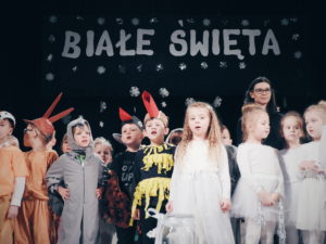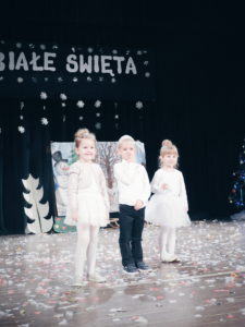 Uroczystość rozpoczęto inscenizacją pt. „Białe święta się pamięta” w wykonaniu naszych przedszkolaków. Przedstawienie zyskało uznanie wśród oglądających. Dzieci doskonale poradziły sobie z wyzwaniem aktorskim. Dużym atutem przedstawienia była też scenografia oraz cudowna muzyka klasyczna. Szczególne podziękowania należą się paniom nauczycielkom, które przygotowały dzieci oraz zadbały o scenerię. Dzięki ich ogromnym staraniom mogliśmy zobaczyć ten piękny spektakl.