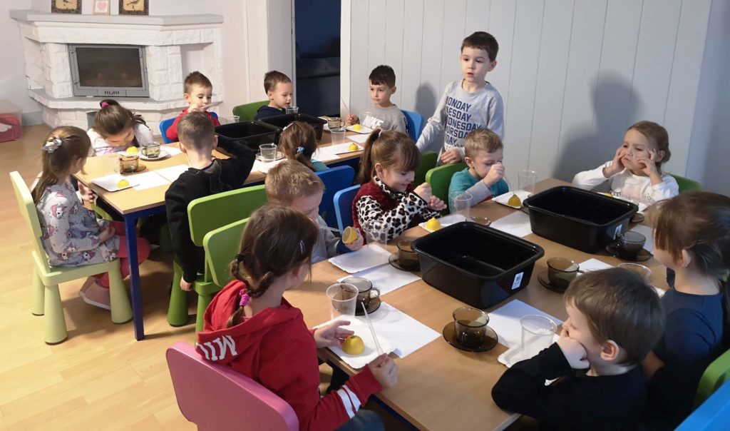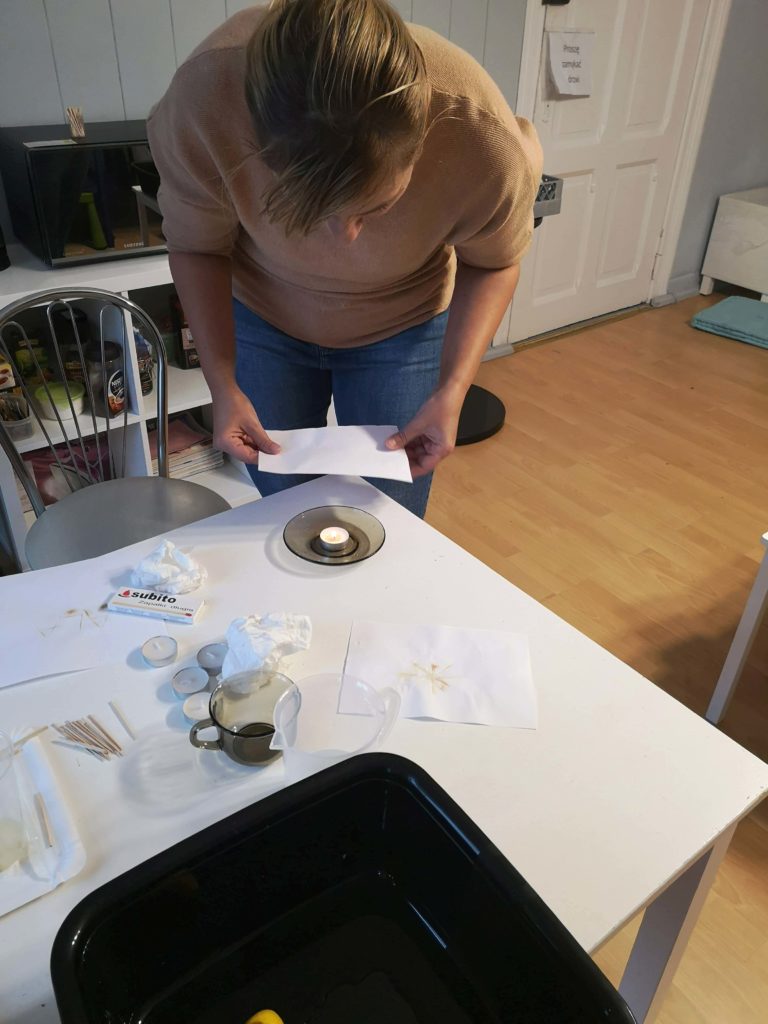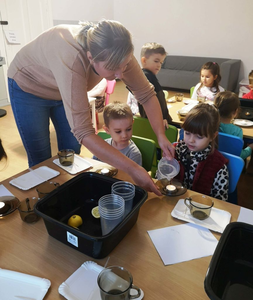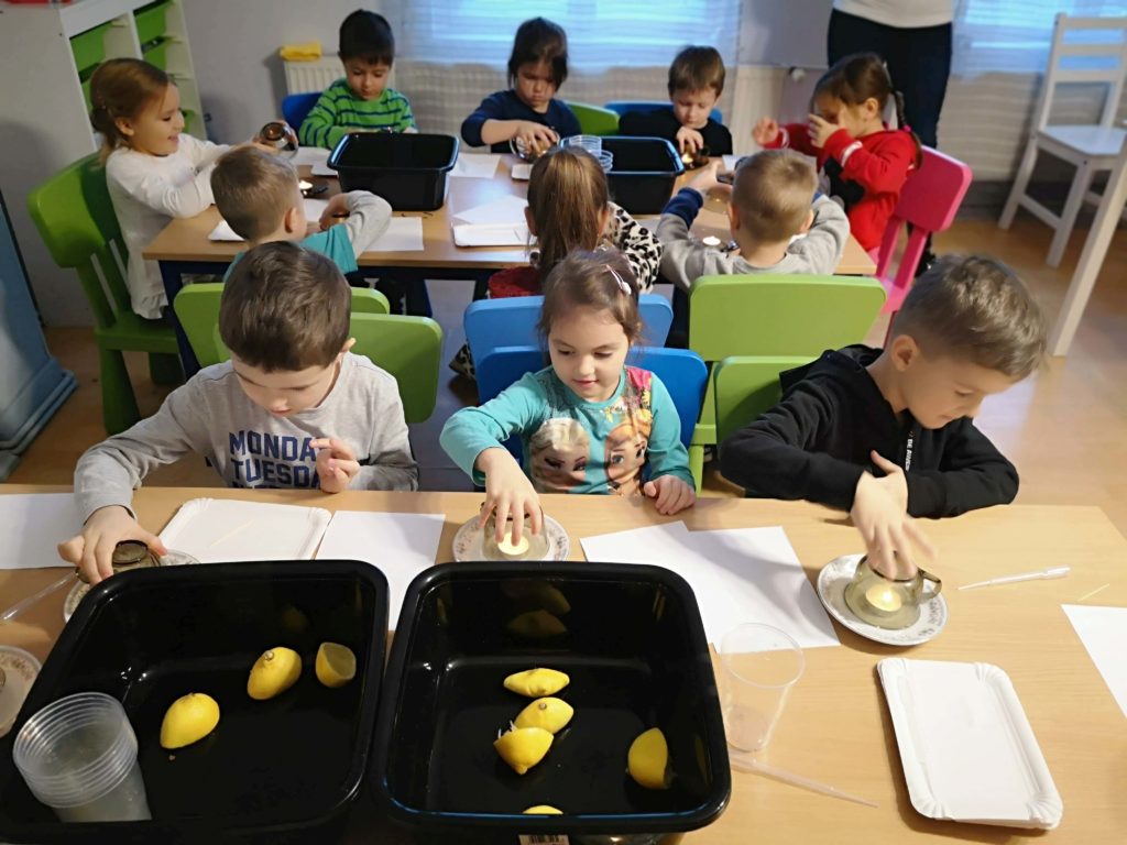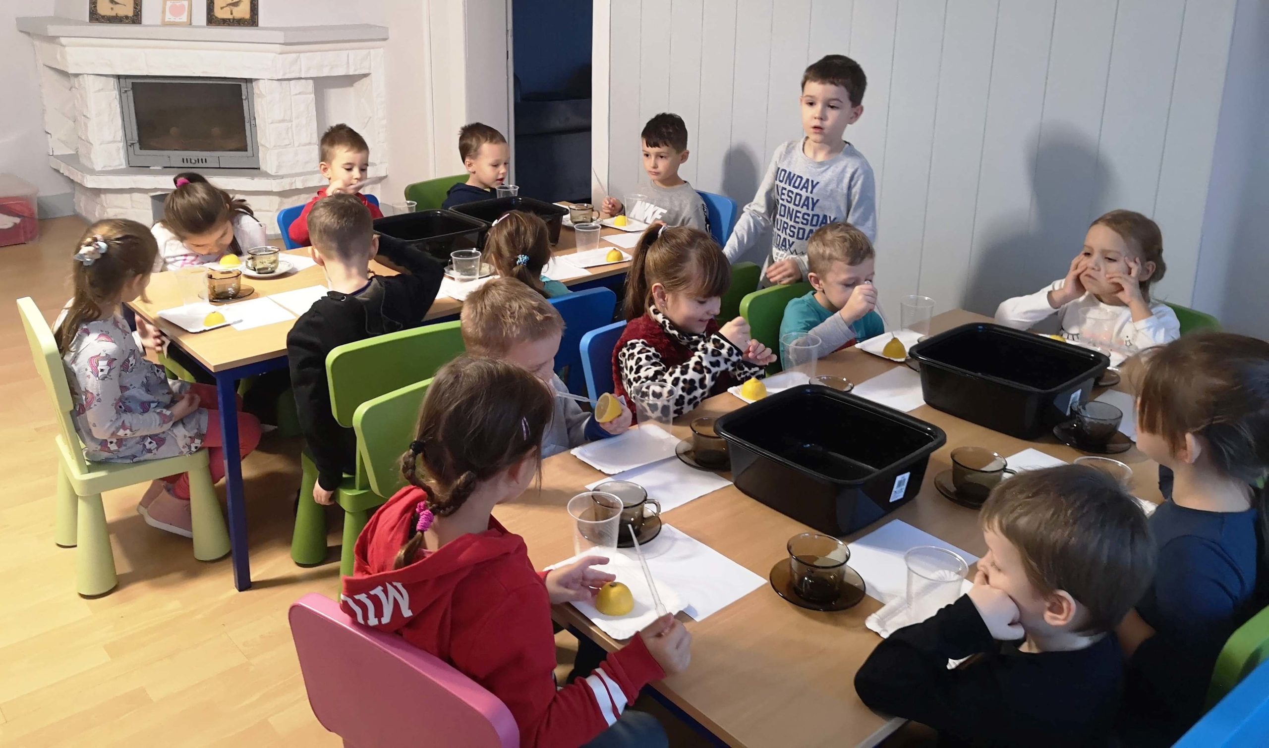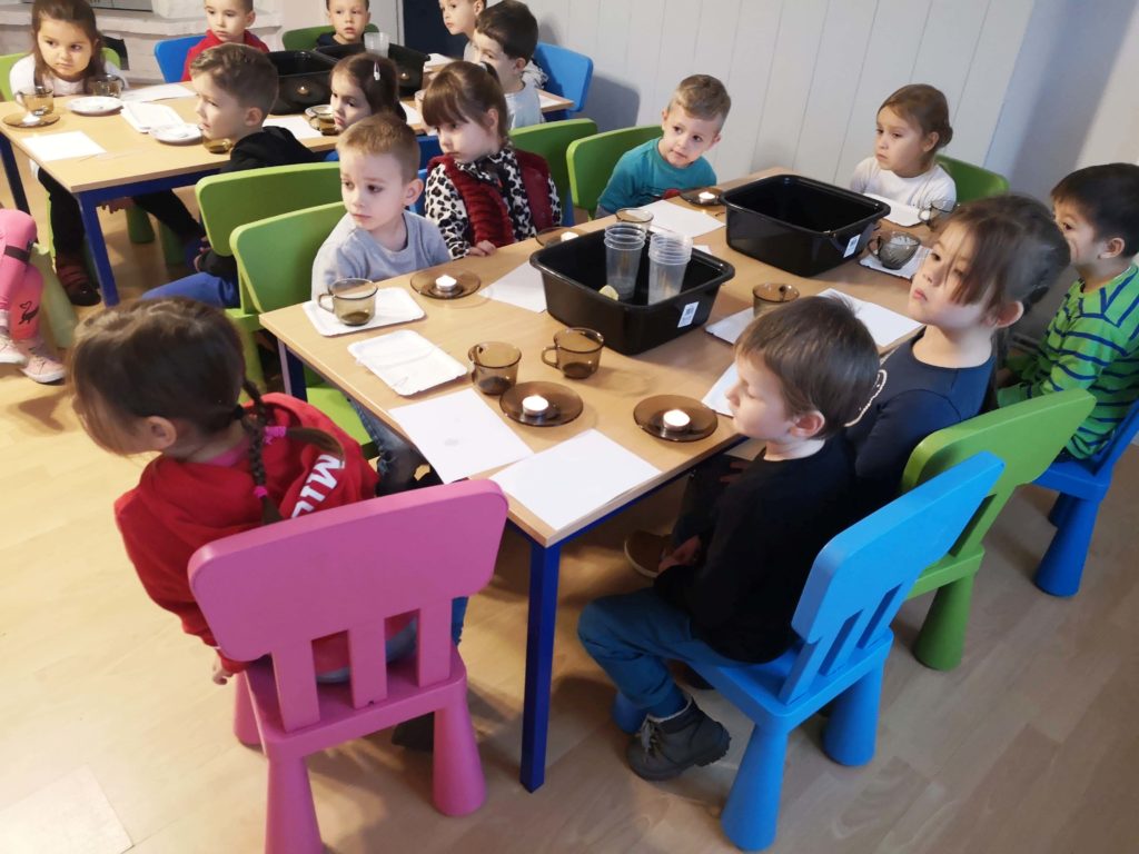 Dnia 15.11.2019 dzieci z grupy „Smerfy” wzięły udział w kolejnych warsztatach pt: „Czarodziejskie pismo”. Tego dnia przedszkolaki wykorzystując sok z cytryny mogły wykonać dowolny rysunek. Następnie pod opieką nauczycieli kartki zostały podświetlone świeczkami, gdzie ukazały się rysunki dzieci. Po wykonanym doświadczeniu przedszkolaki sprawdzały, co dzieje się, gdy świeczka zostaje pozbawiona tlenu. Następnie dzieci podsumowały przedstawione doświadczenia oraz wyciągnęły wnioski.