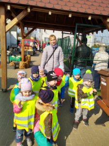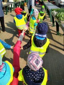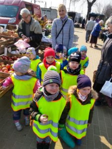 W kwietniu b.r. w grupie Jagódki zrealizowano m.in. zagadnienia związane z ekologią i zdrowym stylem życia. W ramach realizowanej tematyki 05.04. przedszkolaki wybrały się na targowisko miejskie. Dzieciom podobały się barwne stragany, chętnie zakupiły owoce i warzywa na przedszkolny podwieczorek. Przedszkolaki dowiedziały się także od miejscowych sprzedawców, czym jest ekologiczna żywność i jak nie pomylić jej z żywnością wyprodukowaną na skalę masową z użyciem nawozów.