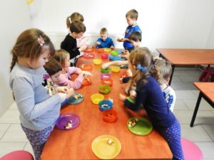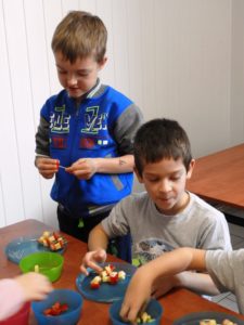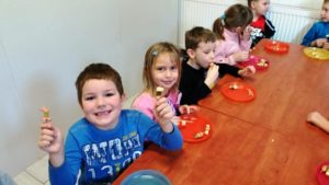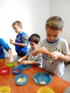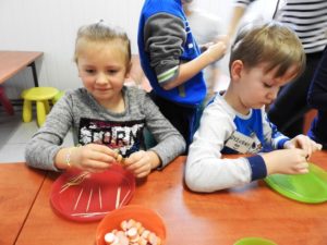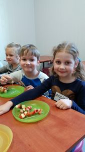 Karnawałowe spotkanie w kuchcikowie przebiegało pod hasłem: „Karnawałowe przekąski – koreczki”. Nabijanie produktów na wykałaczki i tworzenie kompozycji sprawiło Pszczółkom dużo radości