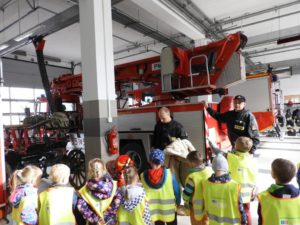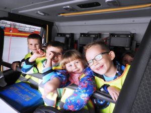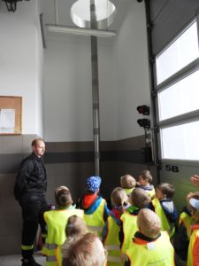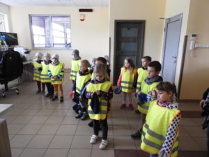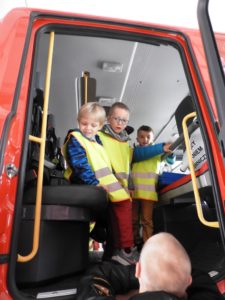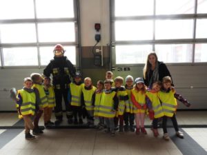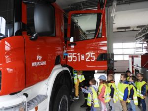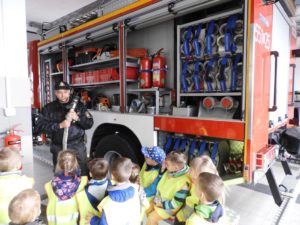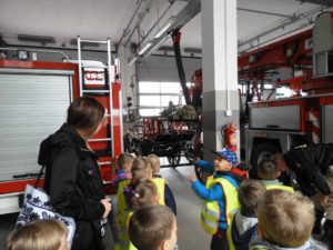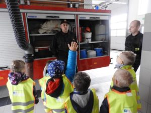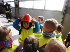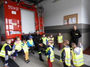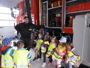 Dnia 4 października dzieci z grupy ,,Wesołe Misie” odwiedziły wąbrzeską jednostkę Państwowej Straży Pożarnej. Celem wycieczki było spotkanie z pracownikami straży, poznanie specyfiki ich pracy oraz obejrzenie sprzętu, jakim dysponuje straż na co dzień. Dzieci mogły zobaczyć w jakim rynsztunku strażacy wyjeżdżają na rożnego rodzaju akcje. Każdy przedszkolak miał możliwość wsiąść do samochodu strażackiego, przymierzyć prawdziwy kask a także przekonać się o tym, że sprzęt używany przez Panów strażaków wcale nie jest taki lekki. Powrót do przedszkola umilały wspomnienia z wizyty.